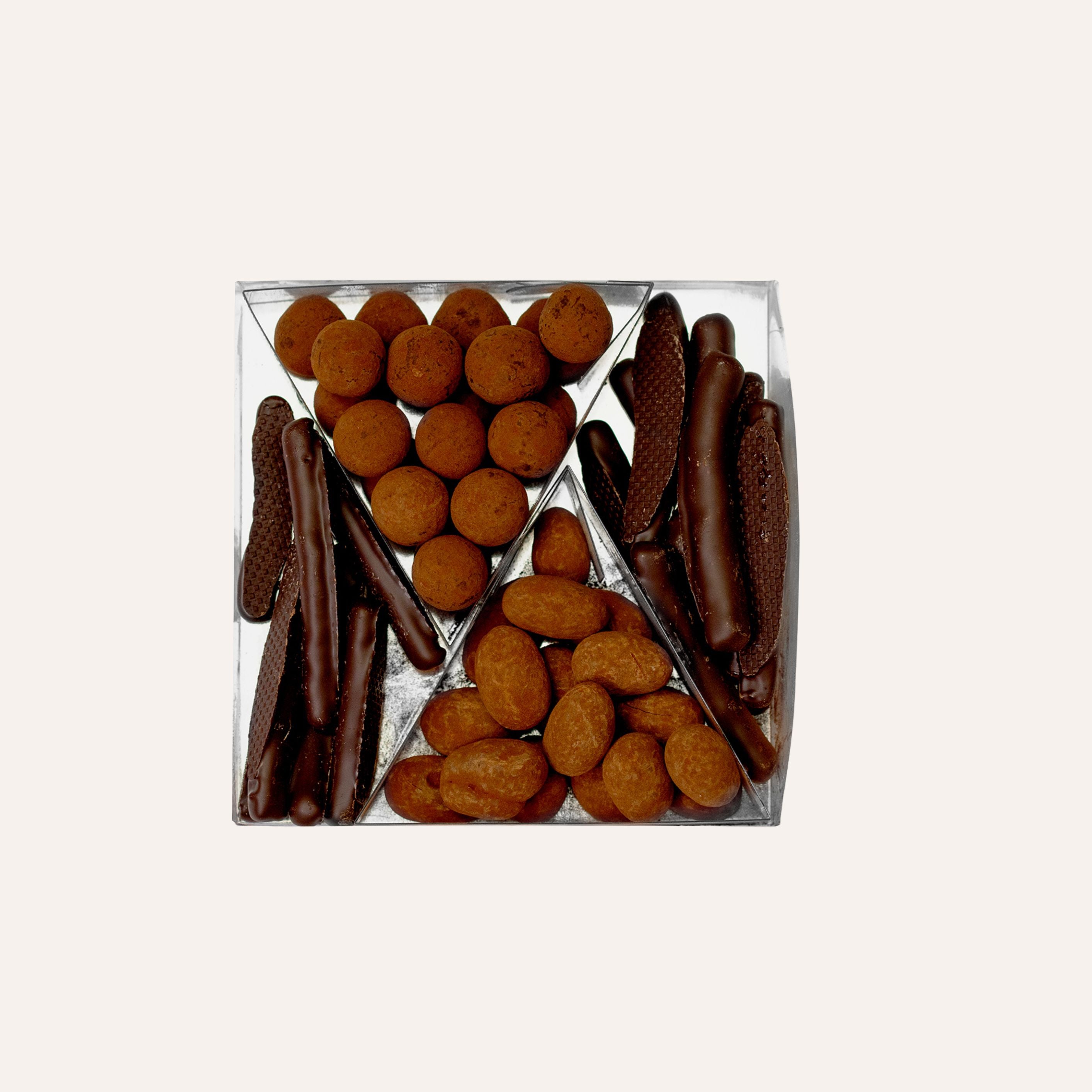 Dans ce coffret, les gourmandises Chapon :Orangettes, Noisettes et Amandes enrobées.