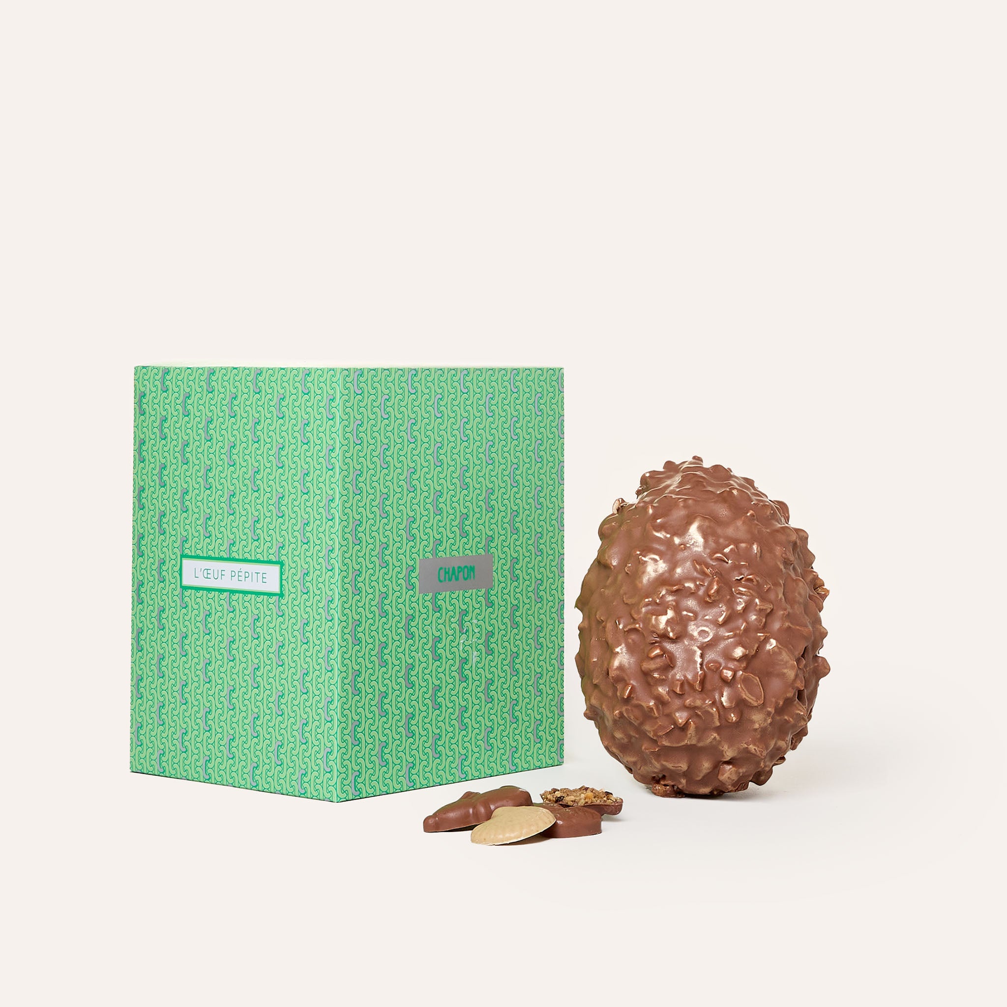 À l’intérieur se cache un assortiment de fritures au cacao rare de Madagascar, de fritures pralinées lait‑pistache, noir‑pistache, lait‑yuzu et chocolat blanc, et d'oeufs pralinés. De la sélection rigoureuse des fèves au moulage minutieux, notre Œuf Pépite Noisette conjugue savoir‑faire et délice à la perfection.