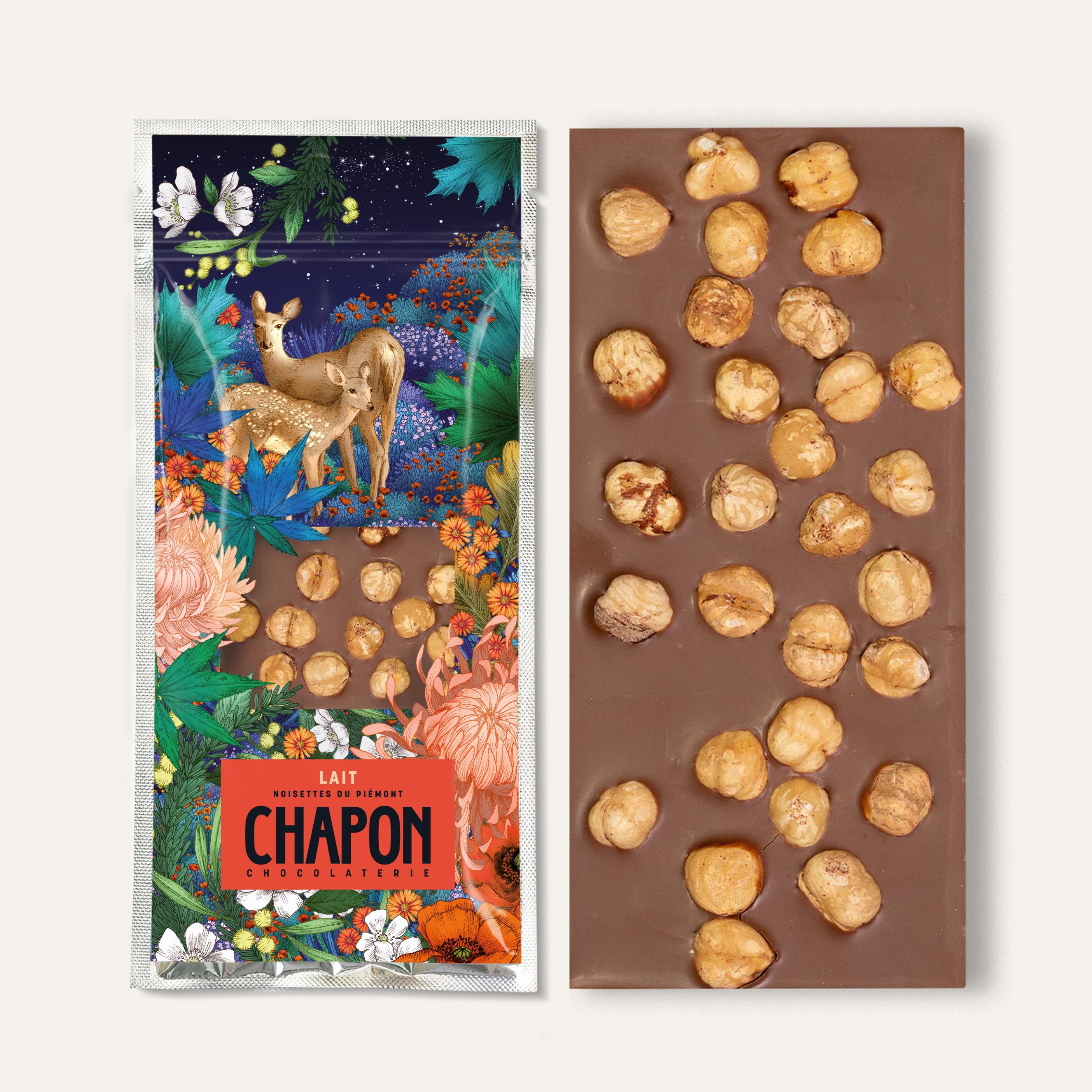Un chocolat légèrement acidulé, mêlant des notes de vin rouge et de balsamique, auquel le lait vient apporter son onctuosité et que le croquant des noisettes du Piémont rend délicieusement gourmand.