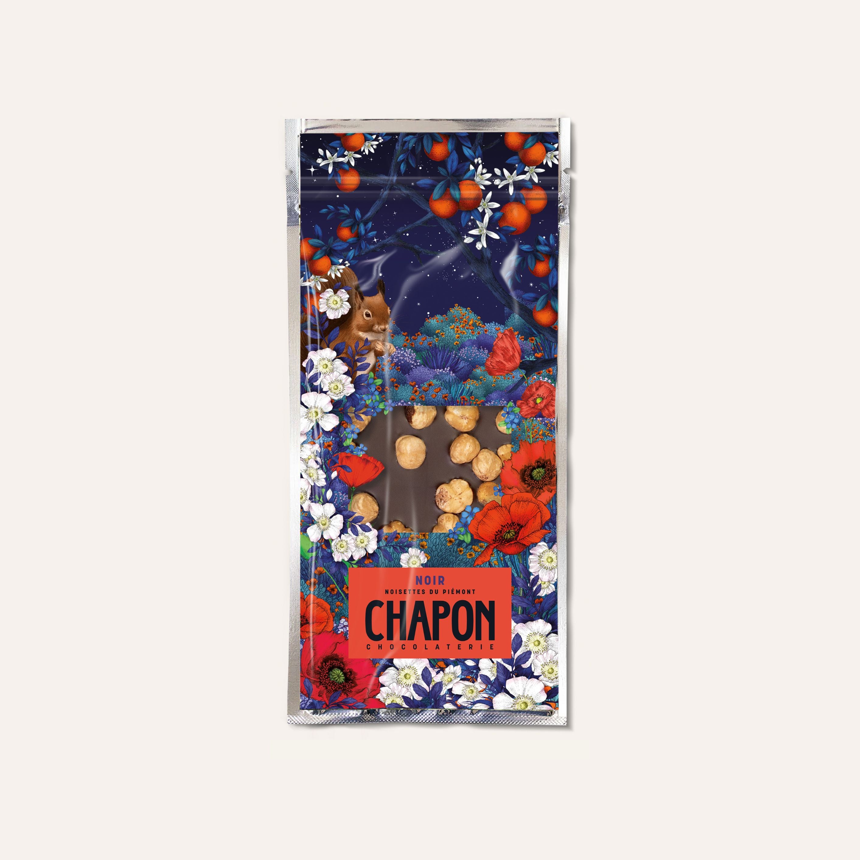 Un chocolat légèrement acidulé, mêlant des notes de vin rouge et de balsamique que le croquant des noisettes du Piémont rend délicieusement gourmand.