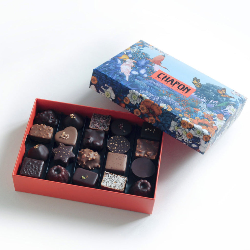 Assortiment de chocolats offrant une sélection de 40 ganaches et pralinés, noir et lait. Le meilleur de Chapon dans un coffret dégustation.