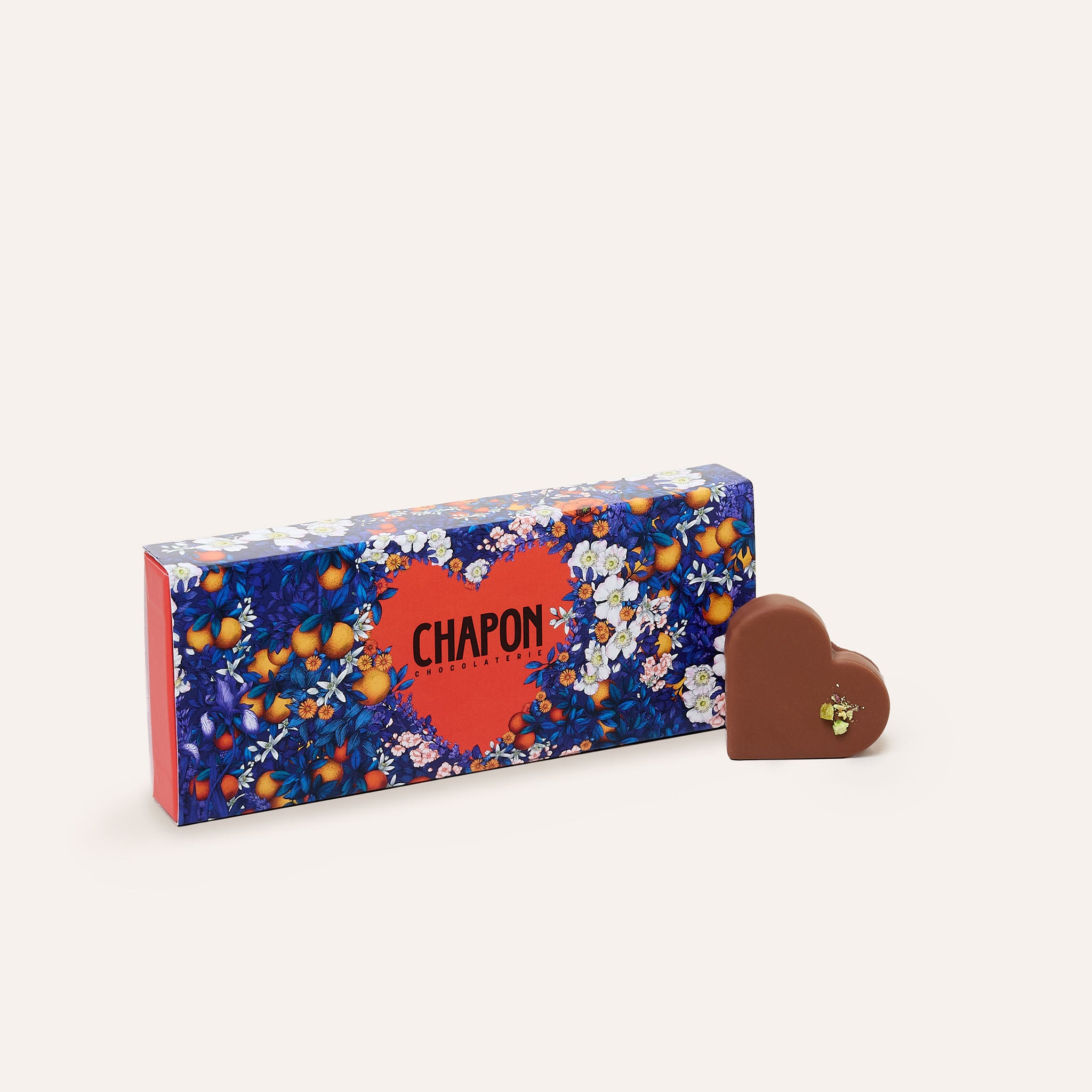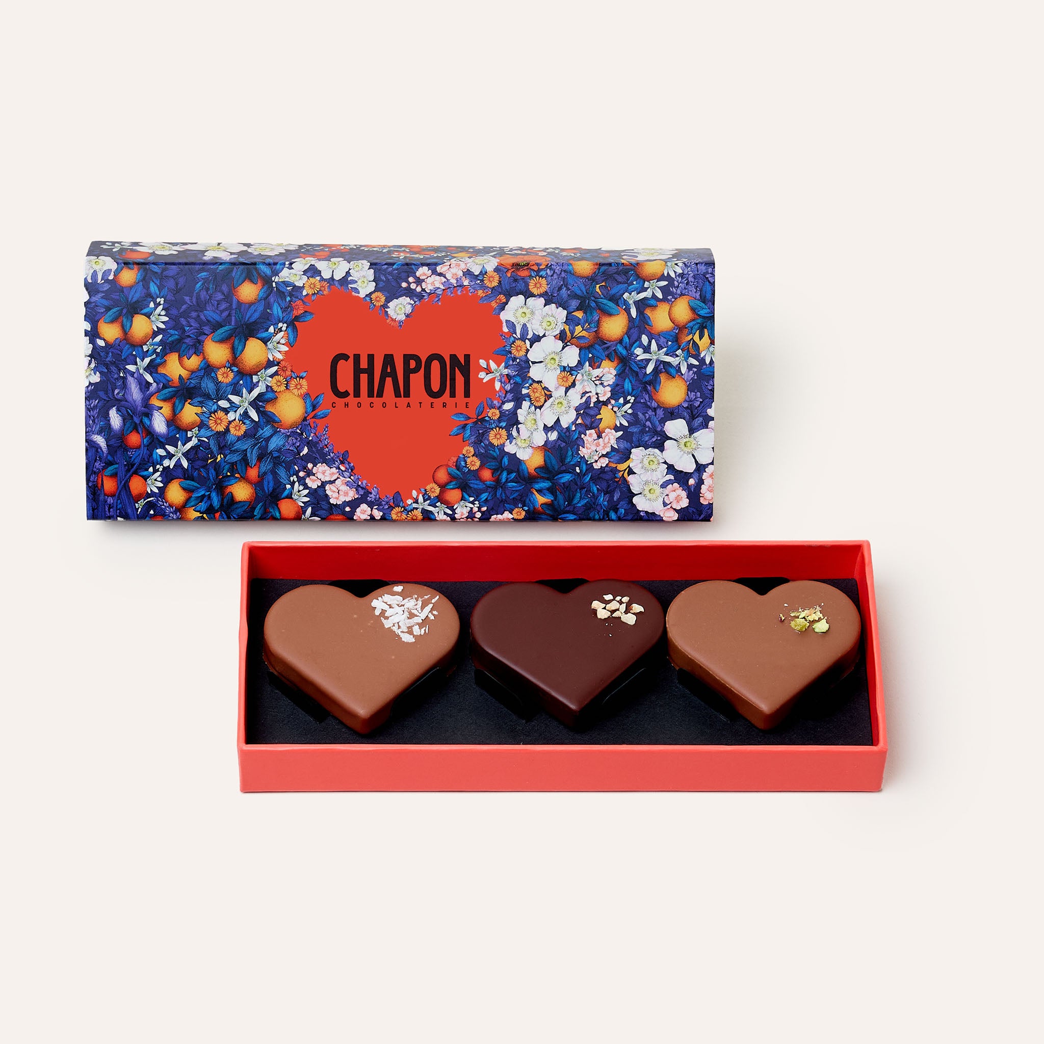 Dans un plumier aux couleurs de la Saint-Valentin, trois cœurs généreux à la texture irrésistible vous font les yeux doux : praliné coco et praliné pistache enrobés de chocolat au lait, et praliné noisette de Seine-et-Marne enrobé de chocolat noir. Des cœurs à prendre, sans attendre !