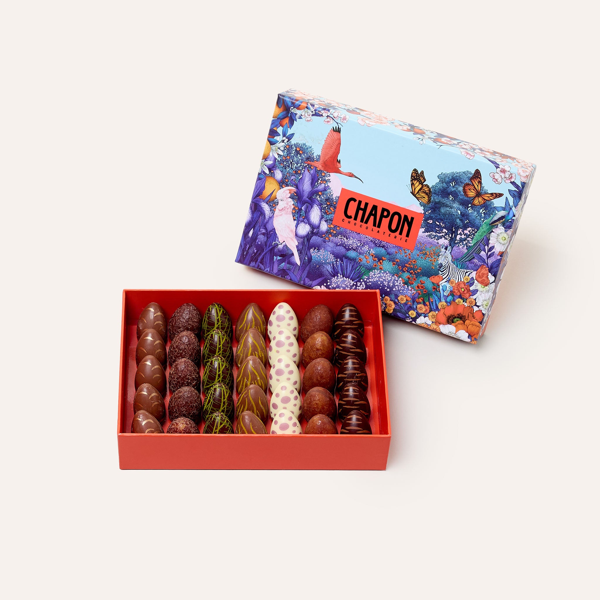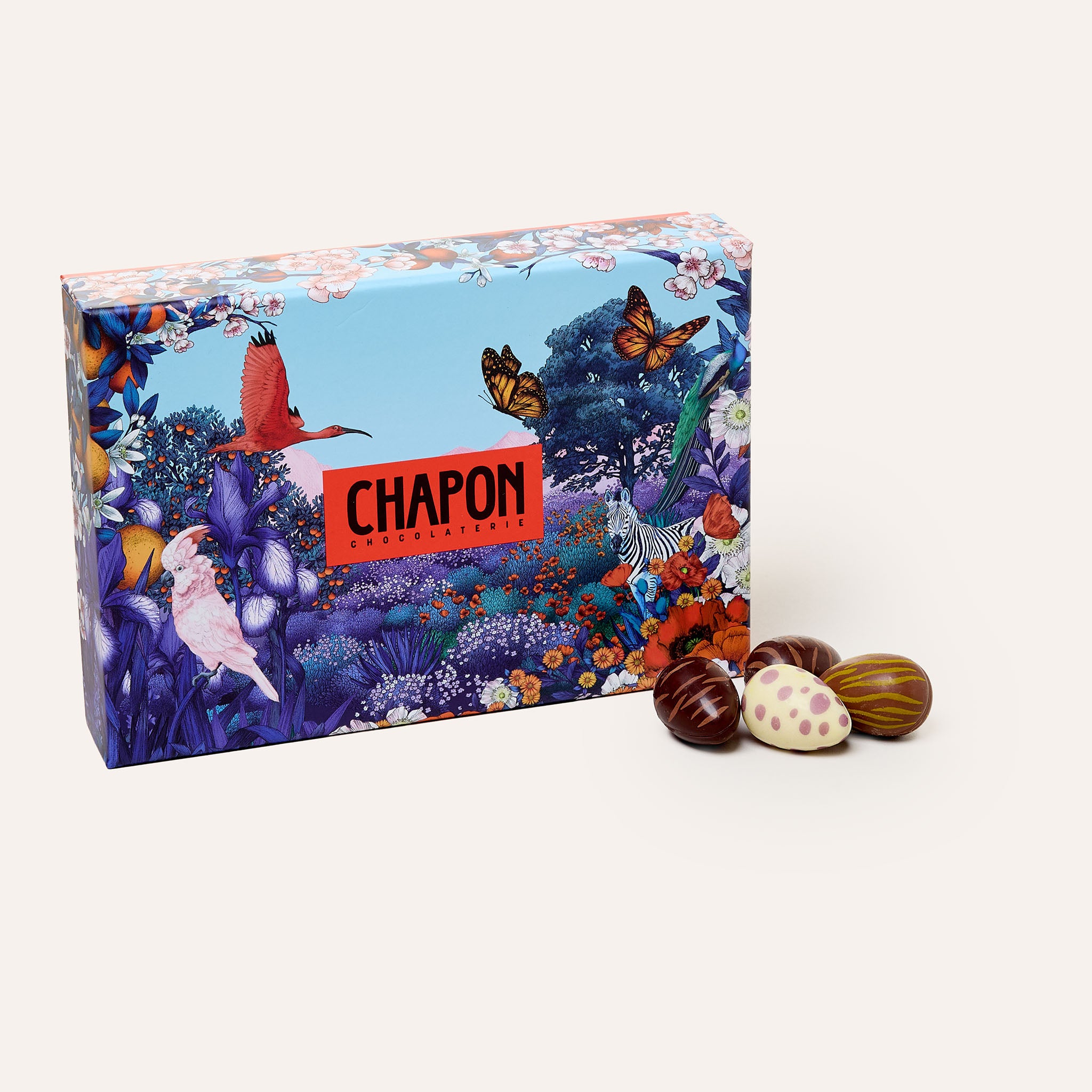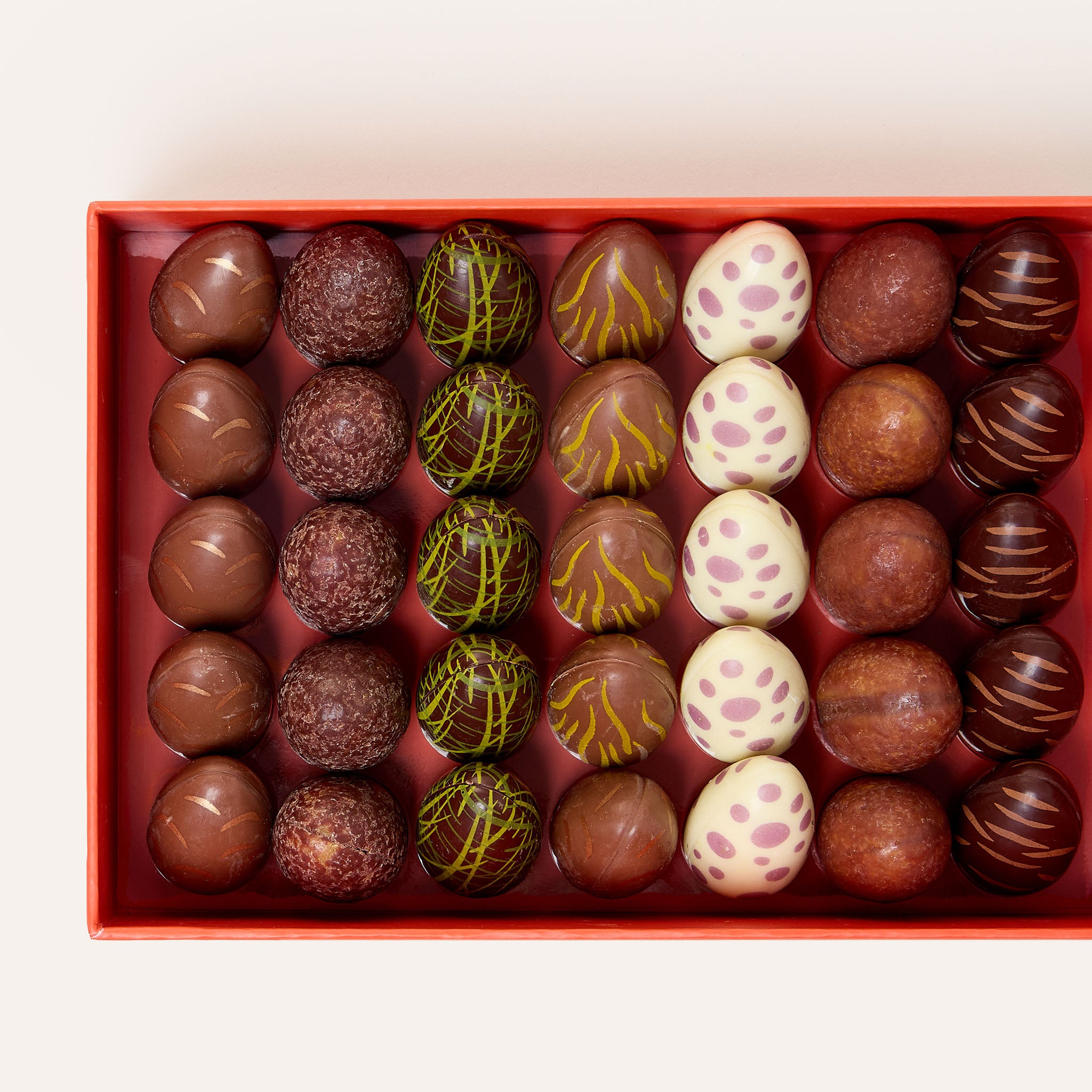 Dans ce coffret généreux, découvrez 35 œufs en chocolat aux saveurs et couleurs merveilleuses. Certains empruntent leur recette à nos bonbons signature, tels que le Canela, le CBF ou le Dôme au sel, tandis que d’autres, mouchetés et striés, s’inspirent de nos héros de Pâques et renferment des pralinés irrésistibles.