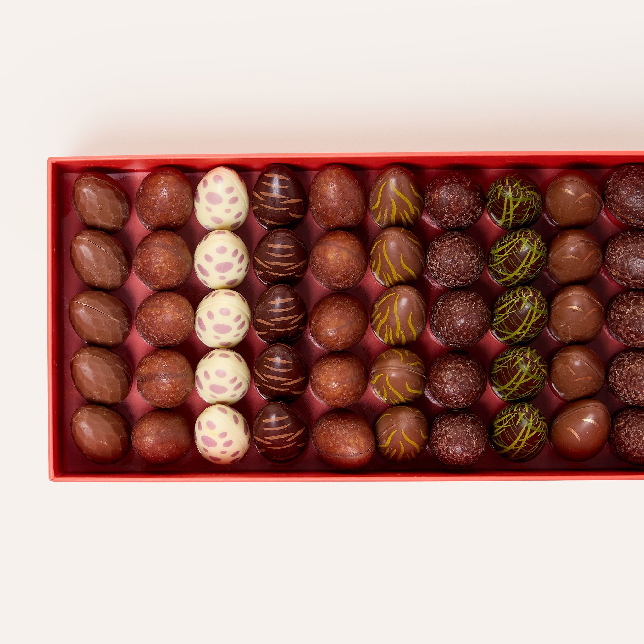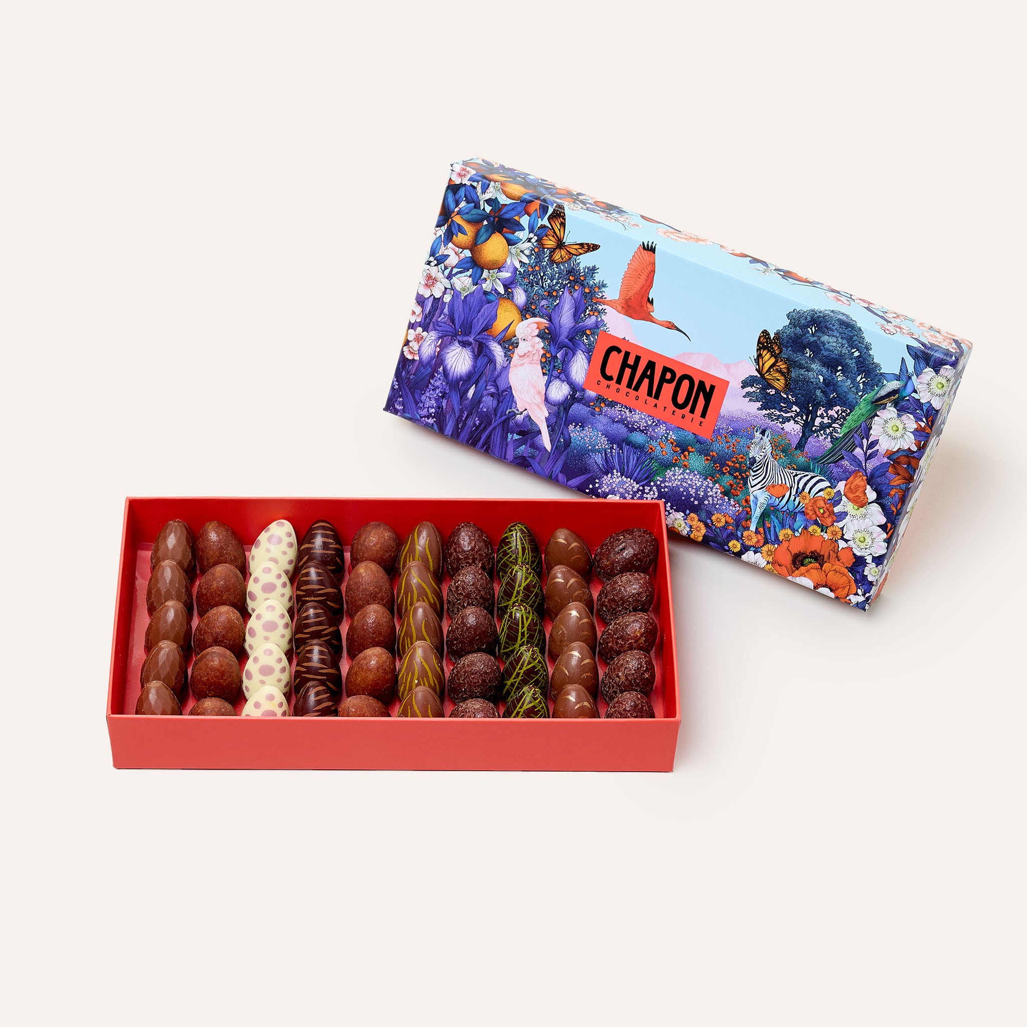 Dans ce coffret infiniment gourmand, découvrez 35 œufs en chocolat aux saveurs et couleurs merveilleuses. Certains empruntent leur recette à nos bonbons signature, tels que le Canela, le CBF ou le Dôme au sel, tandis que d’autres, mouchetés et striés, s’inspirent de nos héros de Pâques et renferment des pralinés irrésistibles.